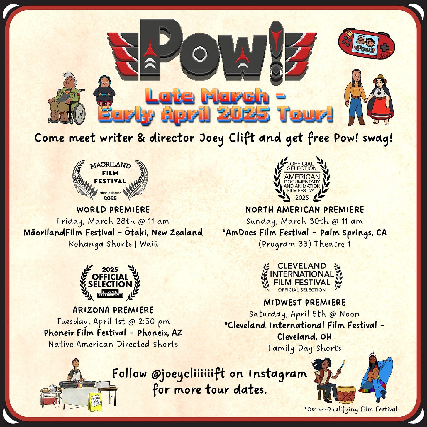 This is a dream film festival lineup for me for our first screenings! Māoriland and Phoenix Film Festival have been very supportive of my work over the years, and CIFF, Athens, Riverrun and AmDocs are all Oscar Qualifying film festivals! One of my goals with Pow! was to show that contemporary Native stories can compete at that level in the animation space and to screen at those festivals is extremely validating!